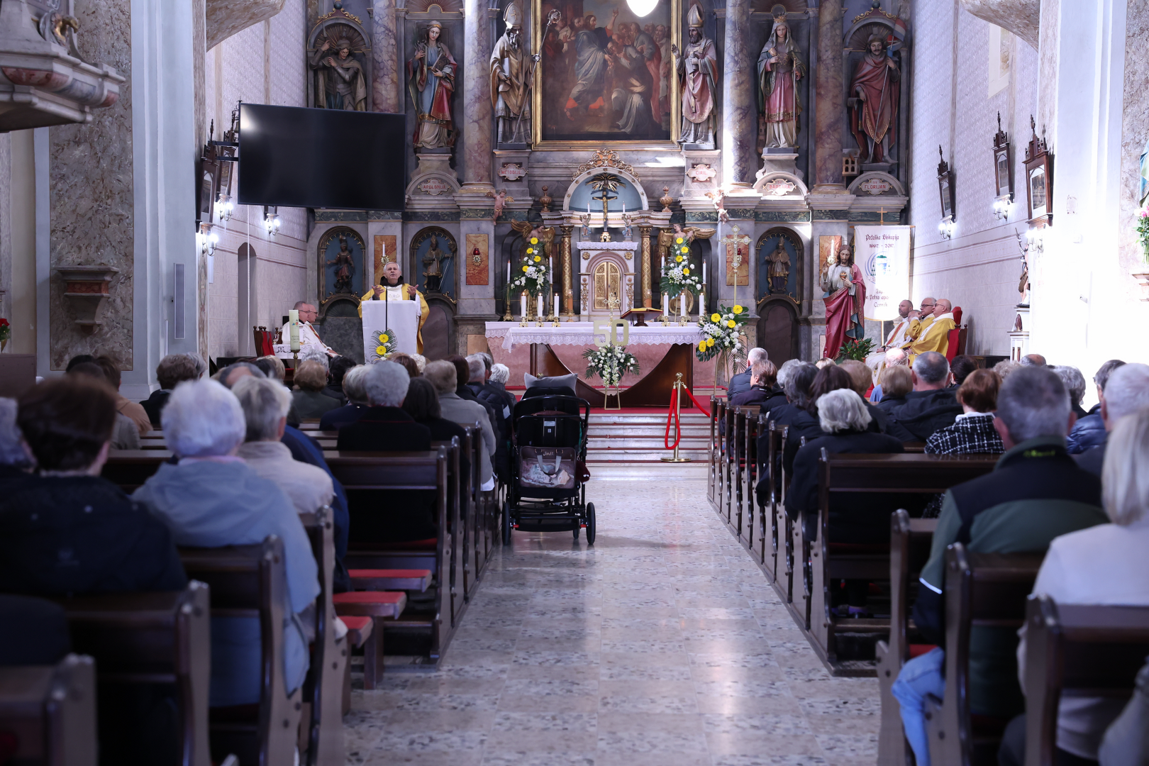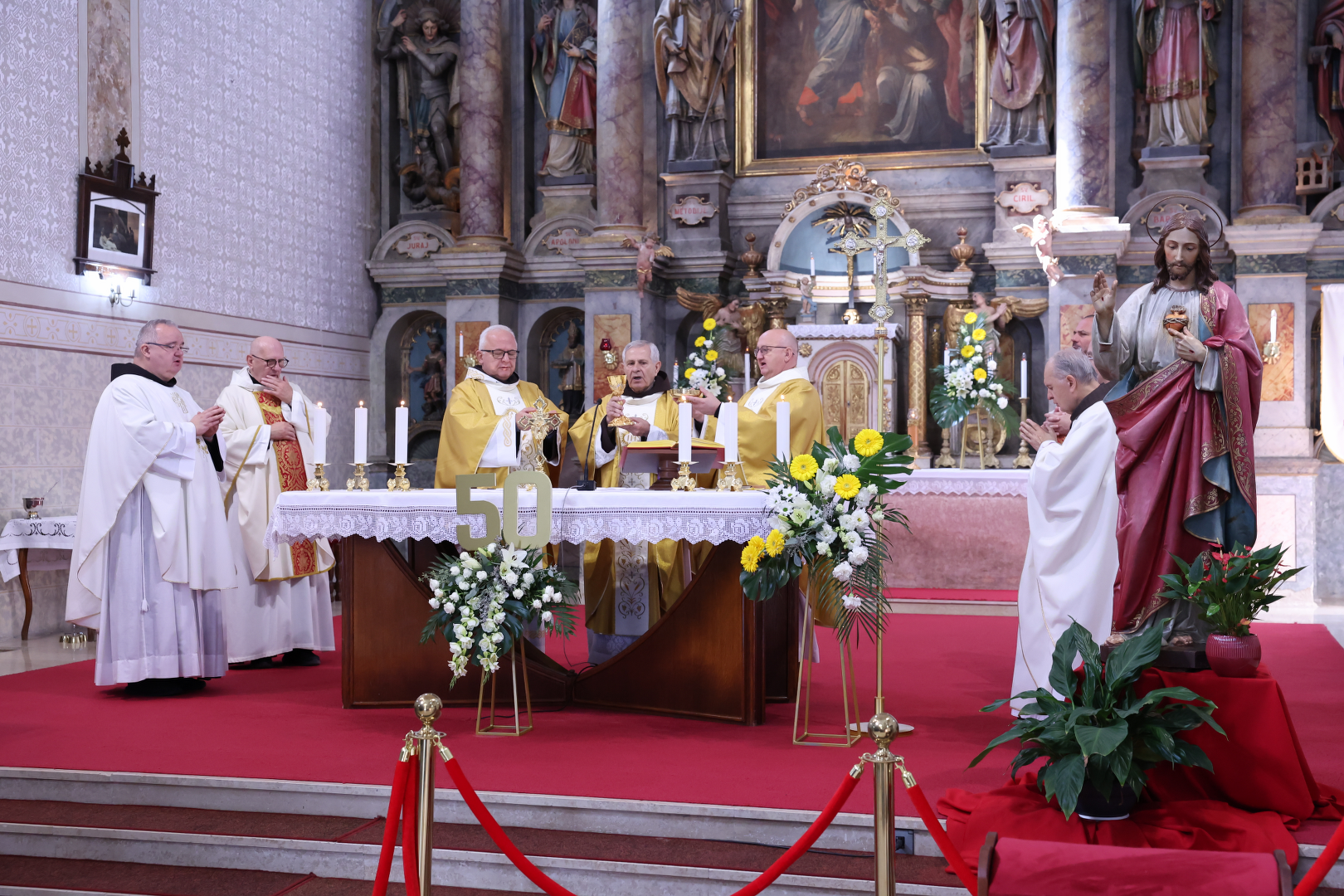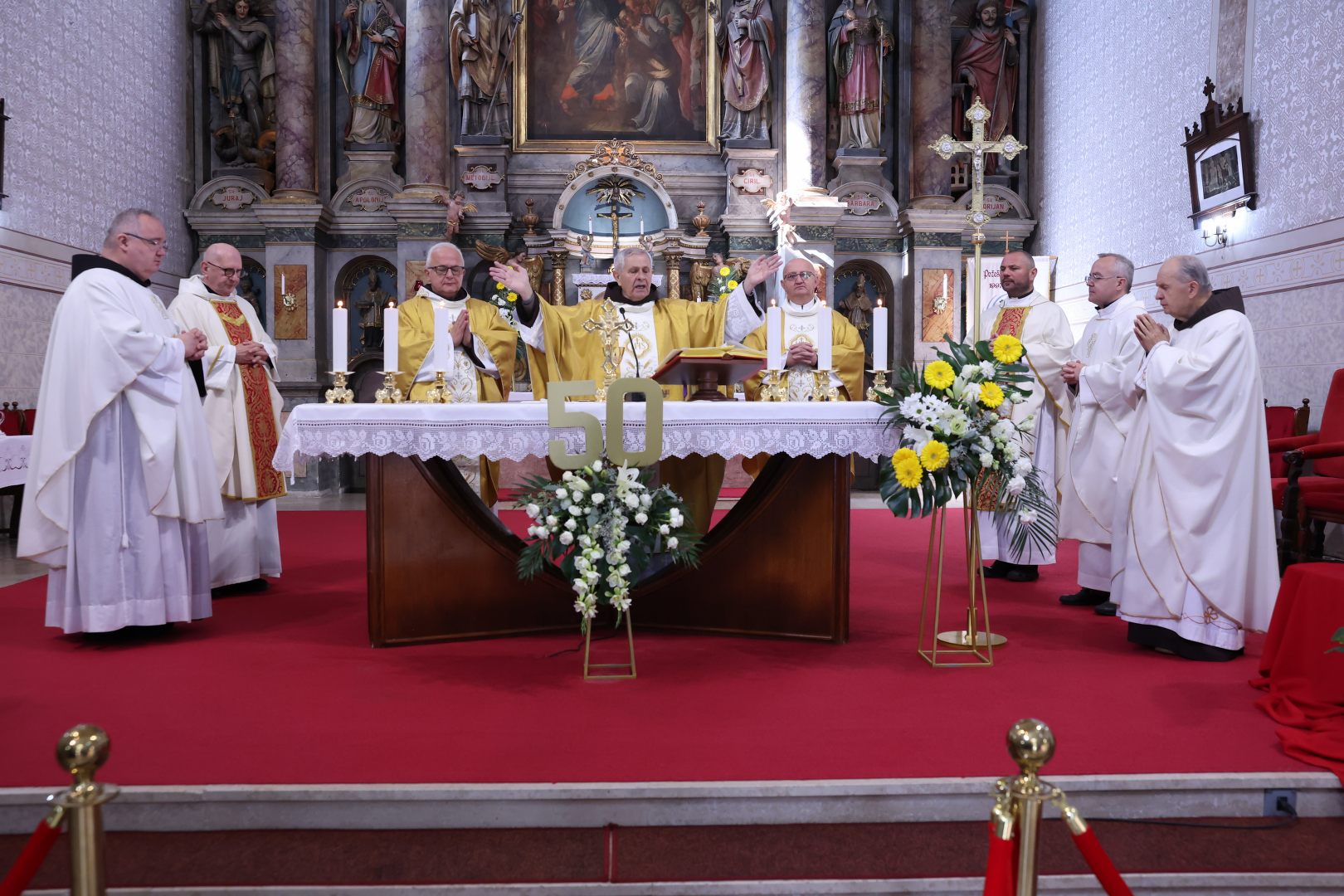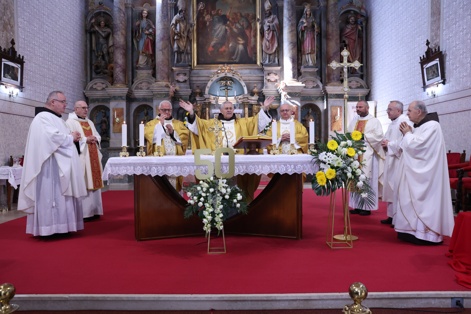 Svečano euharistijsko slavlje predvodio je zlatomisnik fra Vjenceslav Janjić u zajedništvu sa Marijom Sanićem, novogradiškim župnikom, fra Nenadom Meter iz Zemuna, vlč. Mihaelom Kosom, župnik u Orubci, vlč. Željkom Jurkovićem, fra Robertom Perišićem i fra Željkom Paurićem iz Cernika. Na početku misnoga slavlja okupljene je pozdravio te poželio dobrodošlicu fra Josip Grubišić, župnik i gvardijan Franjevačkog samostana u Cerniku.