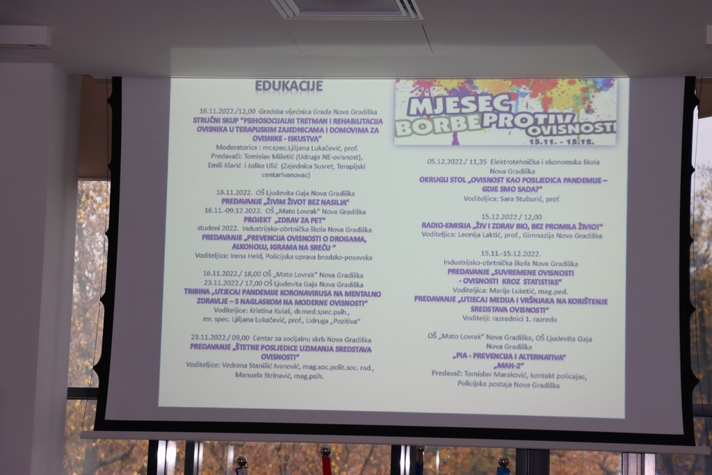 -“Tradicionalno i ove godine nositelj programa obilježavanja Mjeseca borbe protiv ovisnosti je Koordinacijsko tijelo za prevenciju ovisnosti grada Nova Gradiška. Program je i ove godine vrlo bogat i šarolik i želim zahvaliti svim našim suradnicima u osmišljavanju i provedbi ovoga programa. Mi kao nositelj i ove smo godine objavili službeni poziv za doprinos Mjesecu borbe protiv ovisnosti, na poziv se odazvalo još 10 institucija i udruga. Tako da naši suradnici su OŠ Ljudevita Gaja i OŠ “Mato Lovrak”, ETEŠ, Industrijsko obrtnička, Gimnazija NG, Gradsko društvo CK, Centar za socijalnu skrb, PP Nova Gradiška, Klub liječenih alkoholičara NG i Udruga “Pozitiva”.