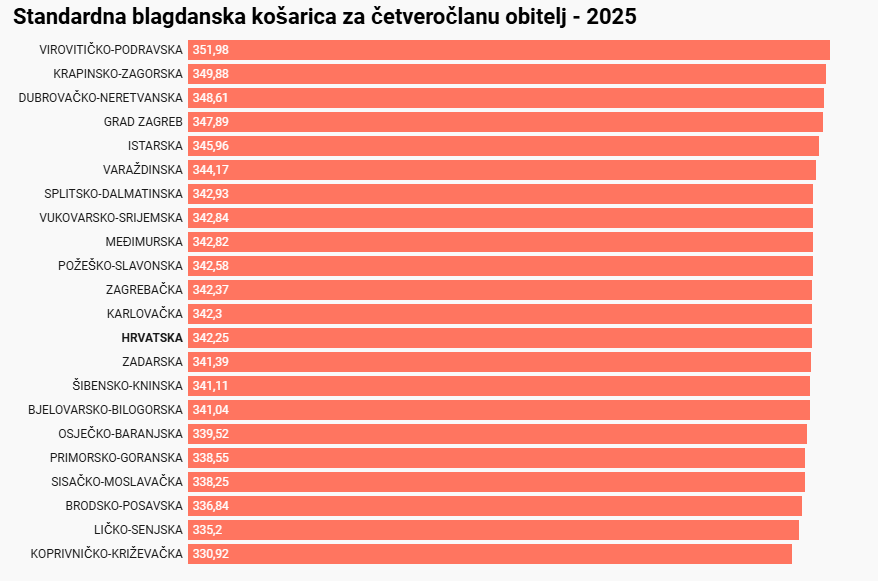 Najskuplja je Virovitičko-podravska županija s 351,98 eura, a prate ju Krapinsko-zagorska (349,88) i Dubrovačko-neretvanska županija (348,61). Ova je košarica najjeftinija u Koprivničko-križevačkoj (330,92), Ličko-senjskoj (335,2) i Brodsko-posavskoj županiji (336,84).