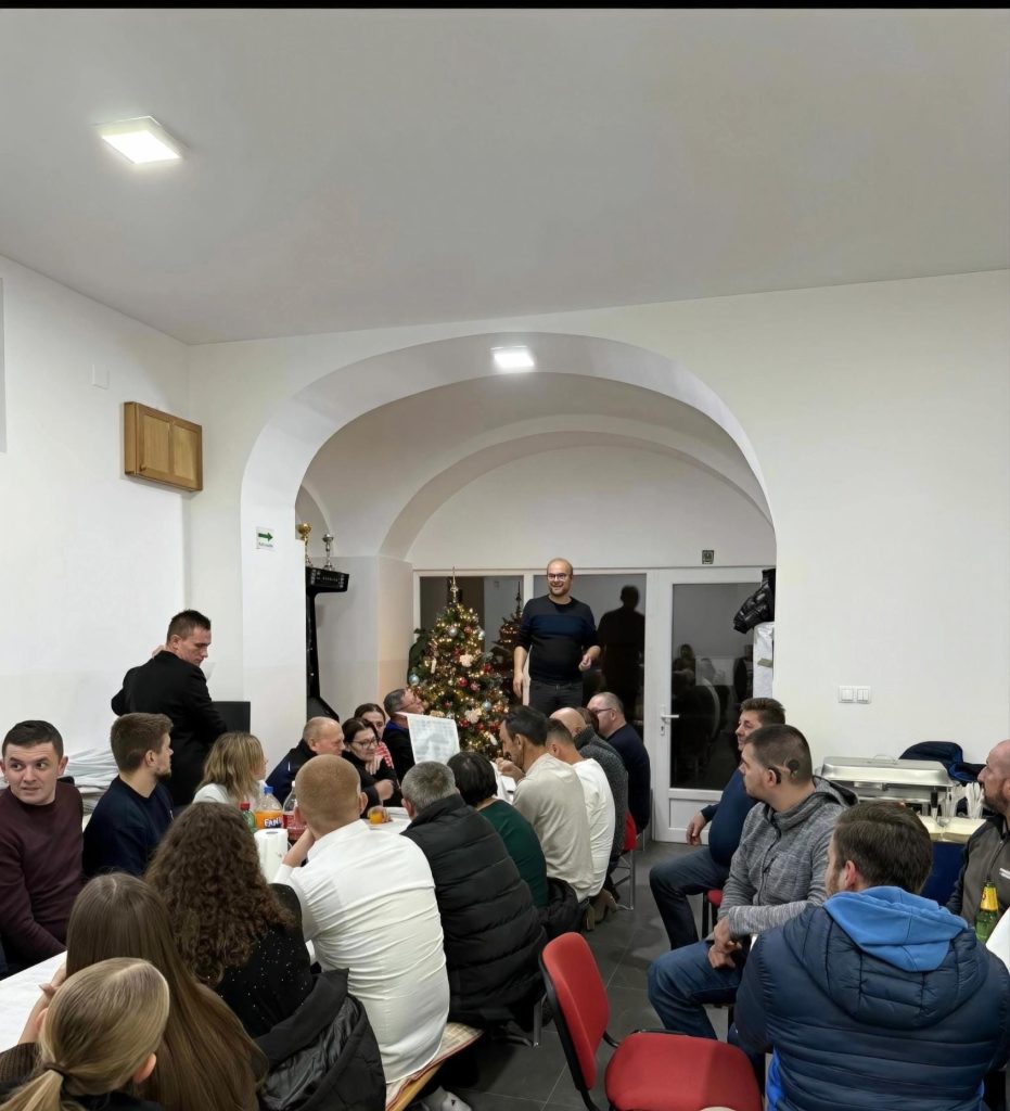 Božićni domjenak započeo je govorom predsjednika Udruge, Josipa Bošnjaka, koji se prisutnima obratio osvrnuvši se na proteklu godinu i rad Udruge. U svom obraćanju istaknuo je važnost odgovornosti, zajedničkog angažmana i kontinuiteta djelovanja, naglašavajući kako su stabilnost i budući razvoj Udruge usko povezani s aktivnim sudjelovanjem njezinih članova. Govor predsjednika poslužio je kao poticaj na razmišljanje o ulozi svakog pojedinca u jačanju Udruge i njezine zajednice.