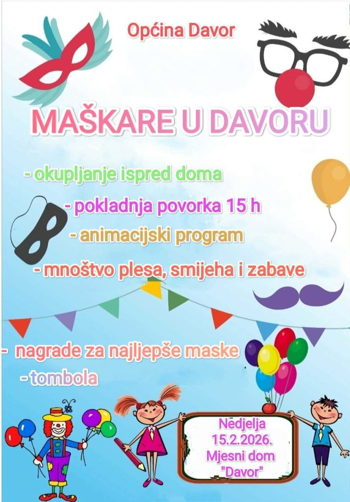 Bliži se najveselije i najšarenije razdoblje u godini, vrijeme maškara! Općina Davor i ove godine poziva sve građane i posjetitelje da se pridruže tradicionalnom maškaranom veselju koje će se održati u nedjelju, 15. veljače, u Mjesnom domu Davor.