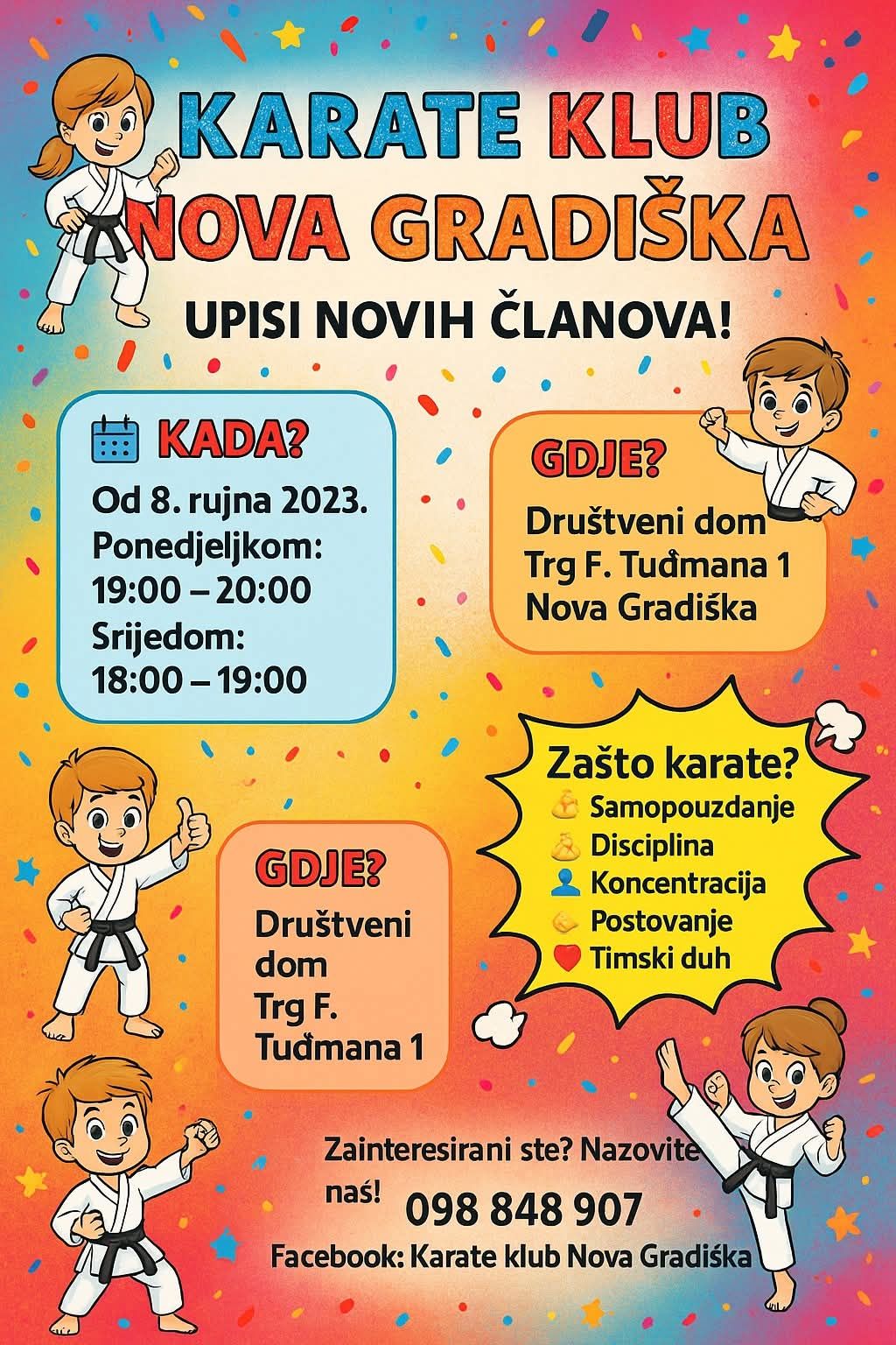 Postani jači, sigurniji i discipliniraniji! Upiši se na karate i otkrij snagu pokreta, timskog duha i samopouzdanja. Dođi, probaj i zaljubi se u karate“, poručuju iz Karate kluba Nova Gradiška.