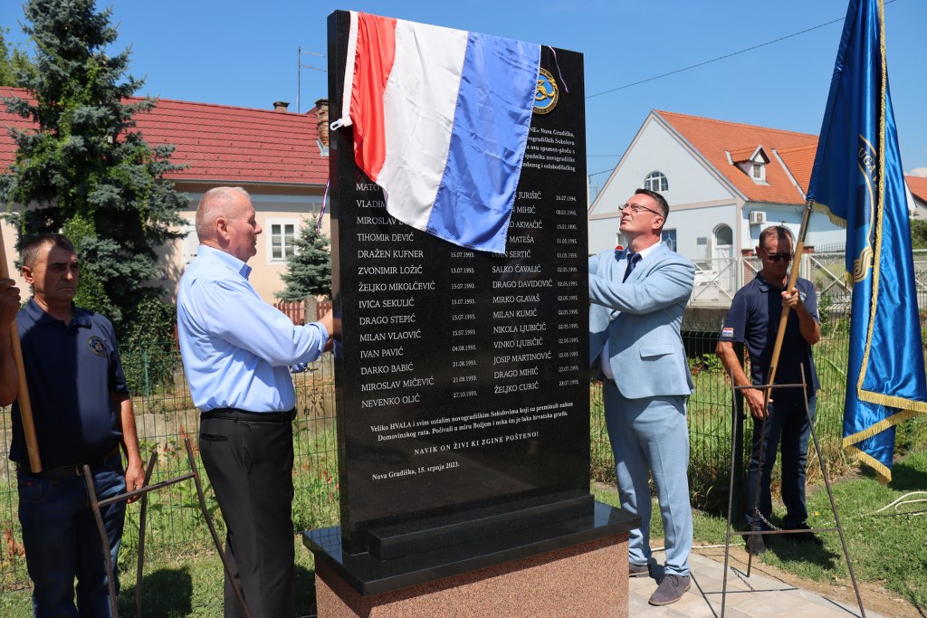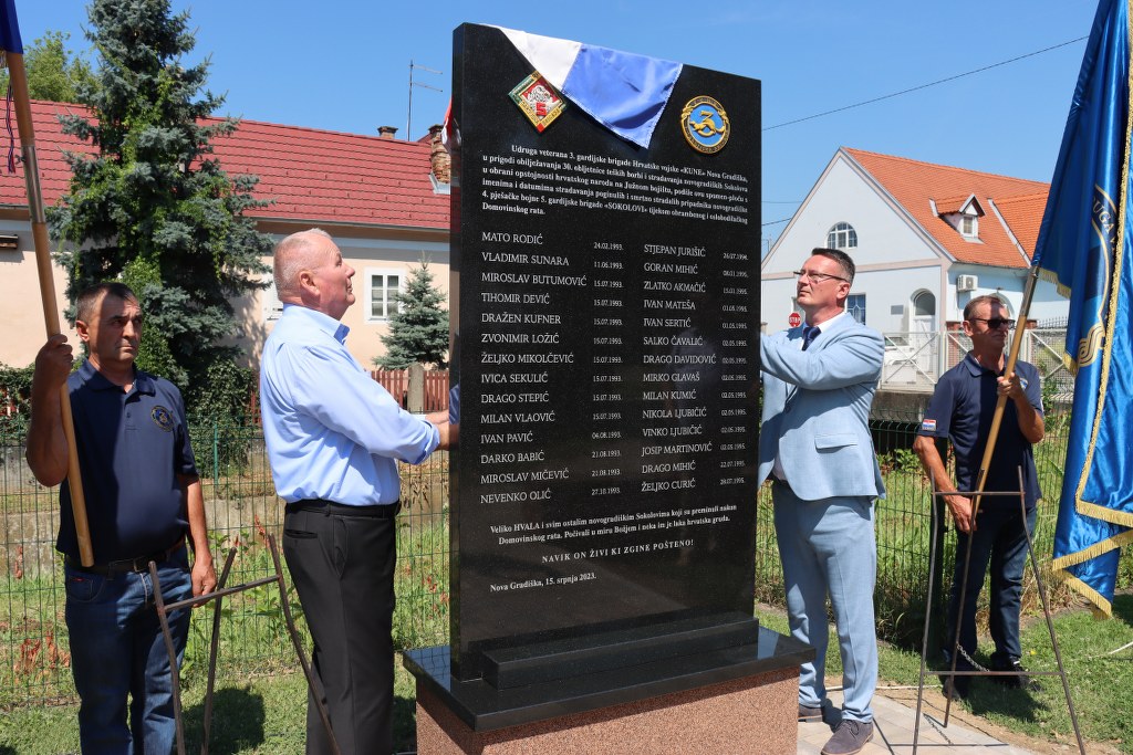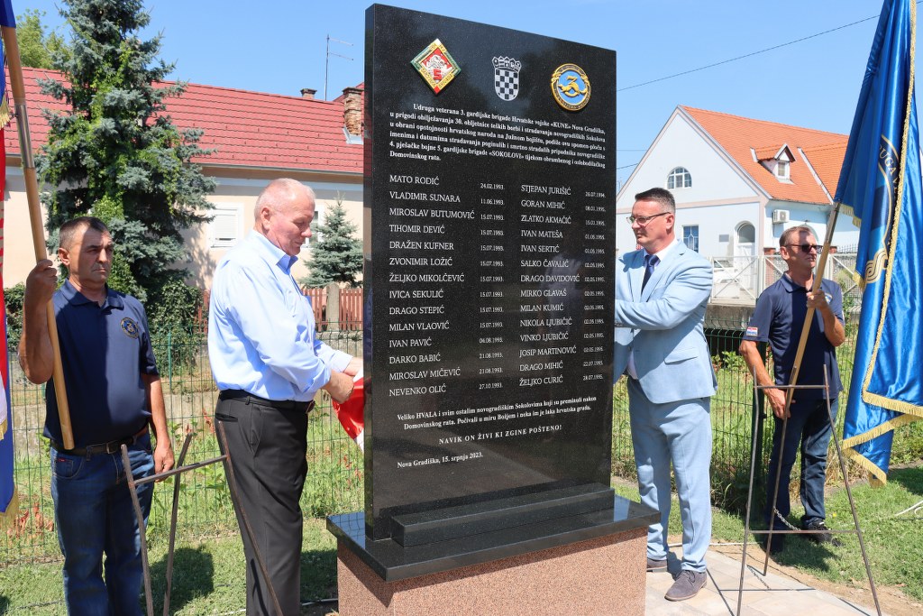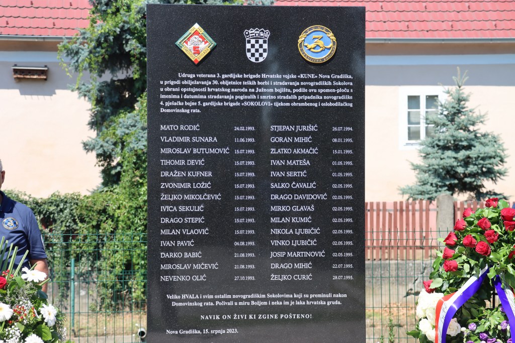 U prigodi 30. obljetnice teških borbi i stradavanja novogradiških “Sokolova” na Južnom bojištu, jučer je kod Doma hrvatskih branitelja u Novoj Gradiški svečano otkrivena spomen-ploča s imenima 28 poginulih pripadnika ratne novogradiške 4. pješačke bojne 5. gardijske brigade “Sokolovi”.