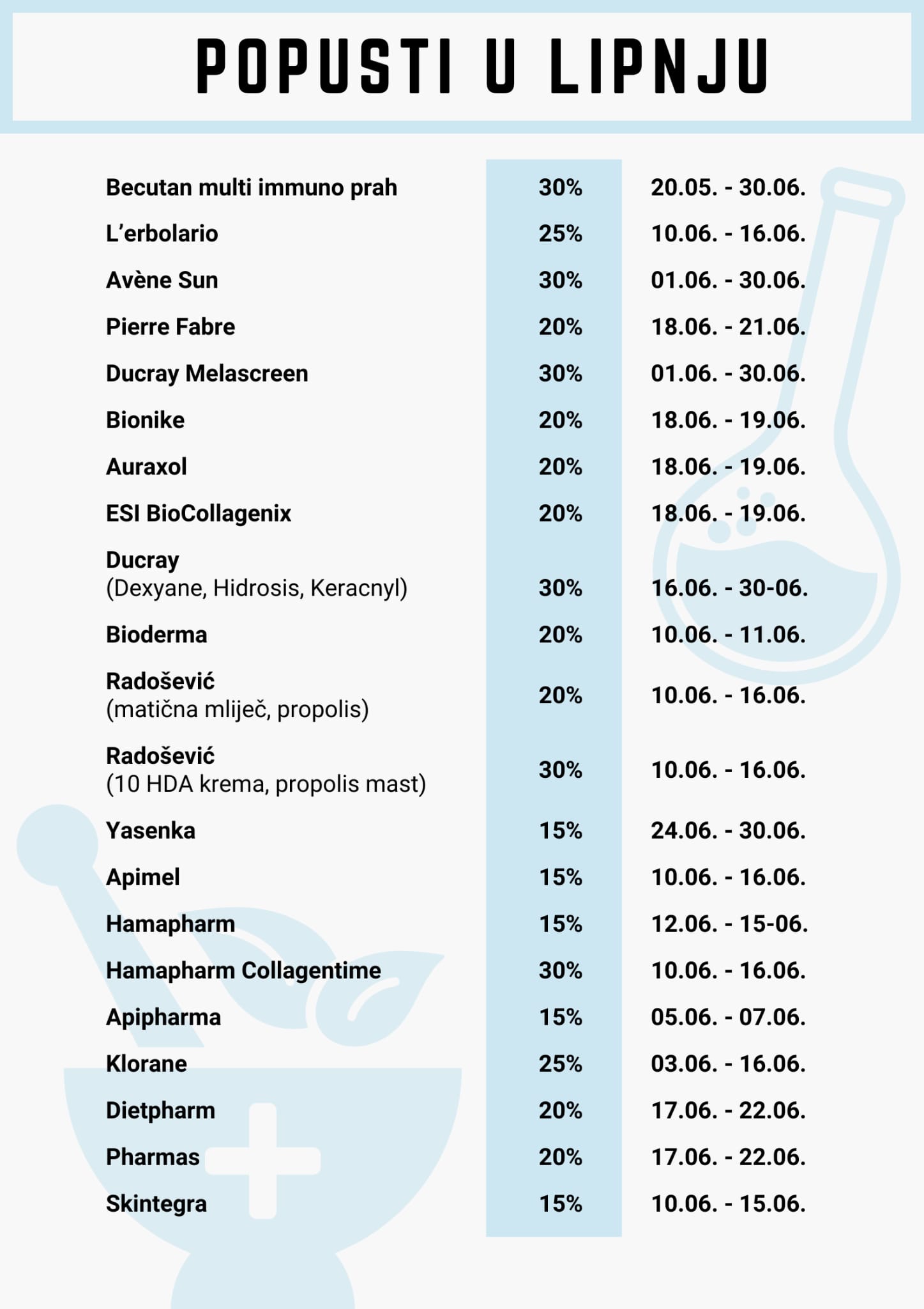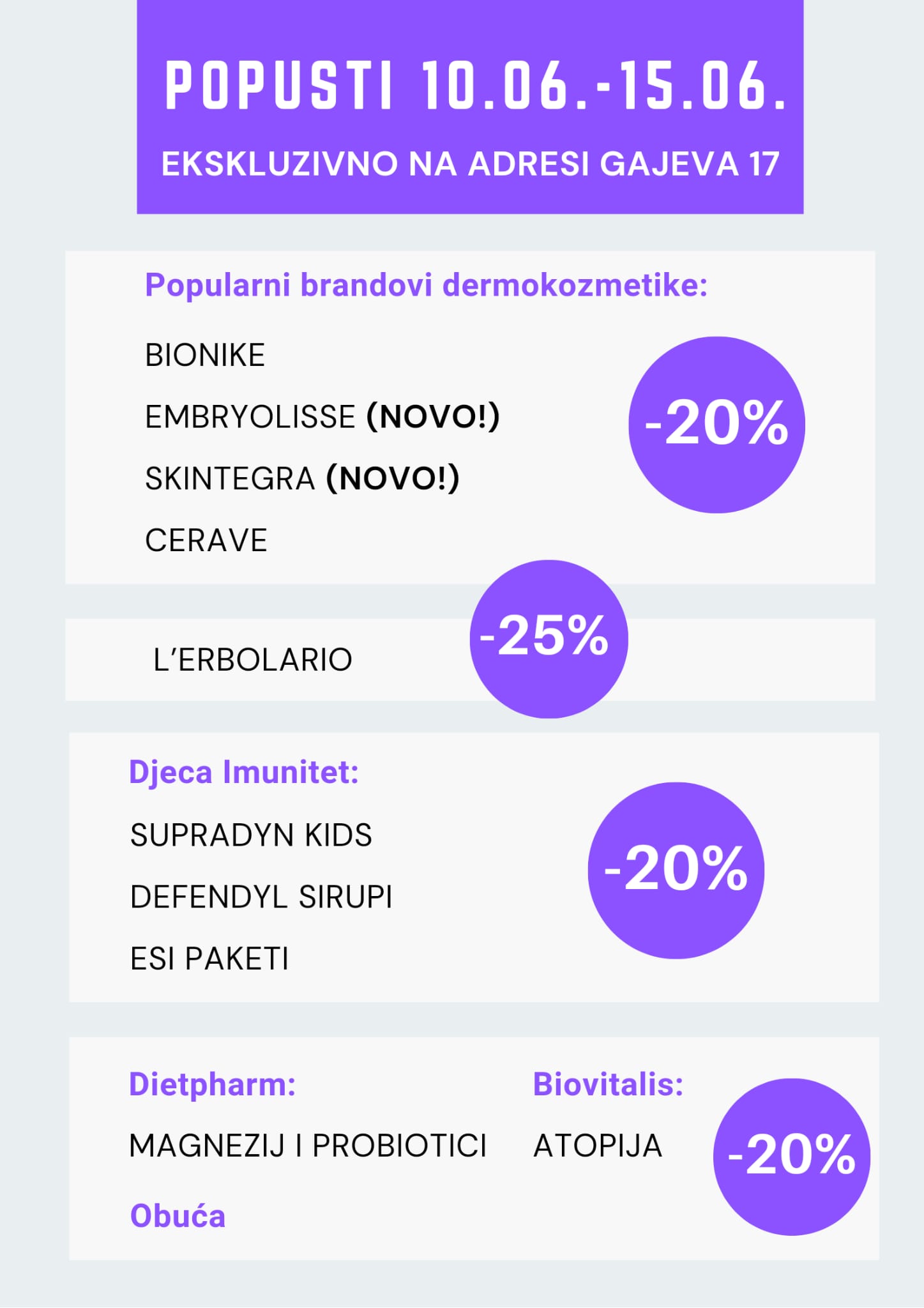 Na novoj lokaciji u Gajevoj 17 radi stručni kadar u dvije smjene. Ljekarna je otvorena od ponedjeljka do petka, od 07:00 do 20:00 sati, a subotom od 07:00 do 15:00 sati. Povodom otvorenja, odlučili su svoje lojalne pacijente i sve zainteresirane koji trebaju zdravstvenu skrb i rješenja za svoje higijensko-kozmetičke potrebe uvesti nove ekskluzivne kozmetičke linije. Tim povodom, nagrađuju Vas i prilagođenim cijenama na određene artikle u razdoblju od 10.06. do 15.06.