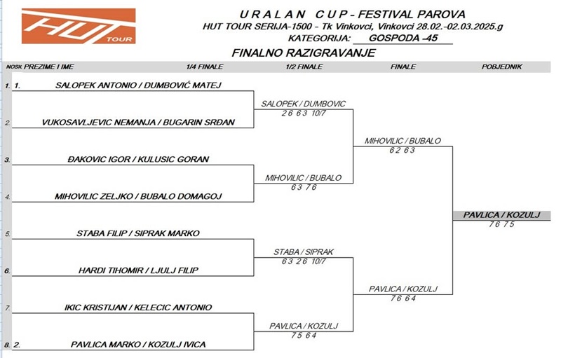 Teniski klub Vinkovci , od 28.veljače do 2. ožujka ove godine, organizirao je URALAN CUP HUT TOUR SERIJA 1500. Marko Pavlica i Ivica Kožulj, članovi Teniskog kluba Nova Gradiška osvojili su turnir parova.