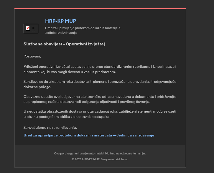 Nacionalni CERT bilježi povećan broj prijava vezanih uz scam poruke u kojima se napadači lažno predstavljaju kao policijska uprava. U sadržaju takvih poruka često se navode i druga tijela i institucije, poput Ministarstva unutarnjih poslova, kriminalističke policije ili čak međunarodnih organizacija poput Europola, kako bi poruka djelovala što uvjerljivije.