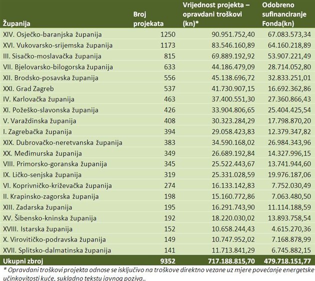 Od 485 lokalnih jedinica u kojima se projekti provode, na prvom mjestu po broju projekata je Zagreb(537), a slijede ga Petrinja te Vukovar, s više od 300 kuća po gradu. Takva raspodjela ne čudi, s obzirom na to da su kuće na područjima od posebne državne skrbi imale pravo na poticaje u visini do 80 posto investicije.