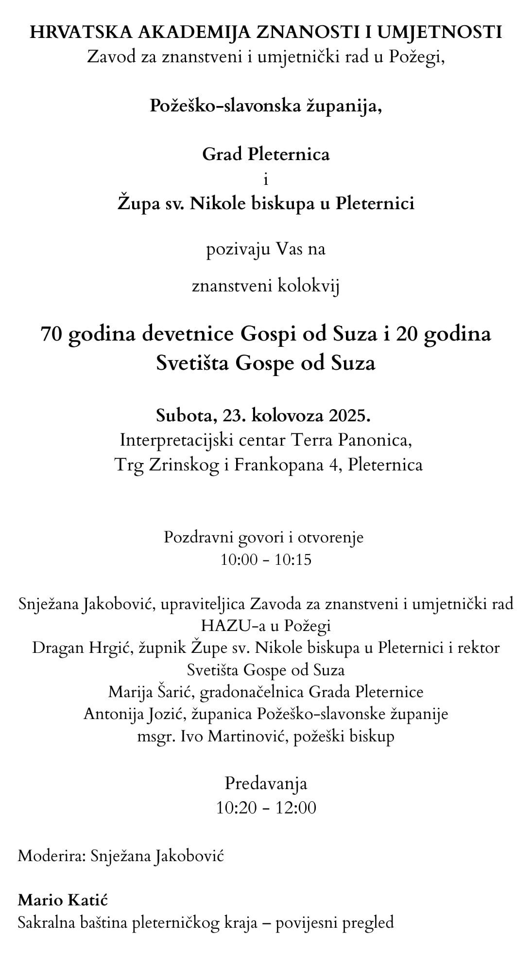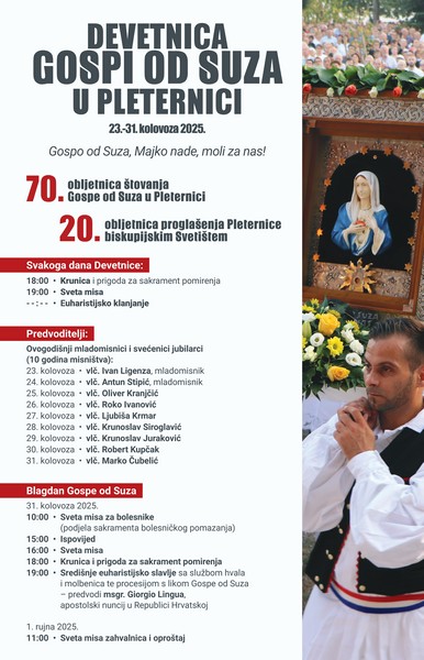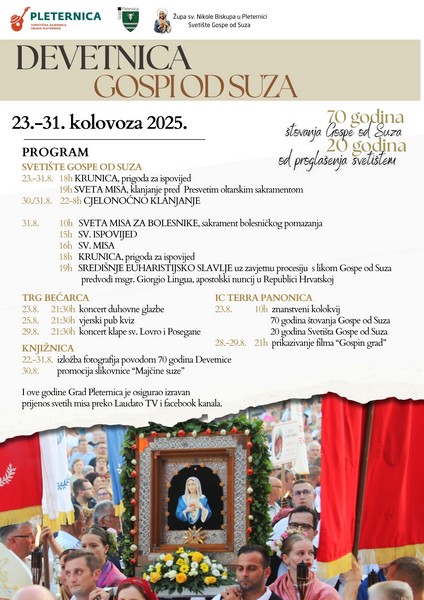 Ove godine s ponosom i zahvalnošću obilježavamo 70 godina štovanja Gospe od Suza u Pleternici te 20 godina od kako je ovo mjesto proglašeno biskupijskim svetištem. Uz redoviti Jubilej kojega je proglasio papa Franjo, na poseban način smo zagledani u Mariju, Majku Nade. U Pleternici u tišini i molitvi čuvamo uspomenu na Gospine suze koje su progovorile svijetu o ljubavi, ali i o potrebi za obraćenjem i vjernošću Bogu. Već sedam desetljeća Gospa u Pleternici okuplja vjernike iz cijele Hrvatske i šire, koji dolaze moliti, zahvaljivati te svoje živote, obitelji i domovinu u Božje ruke povjeravati.