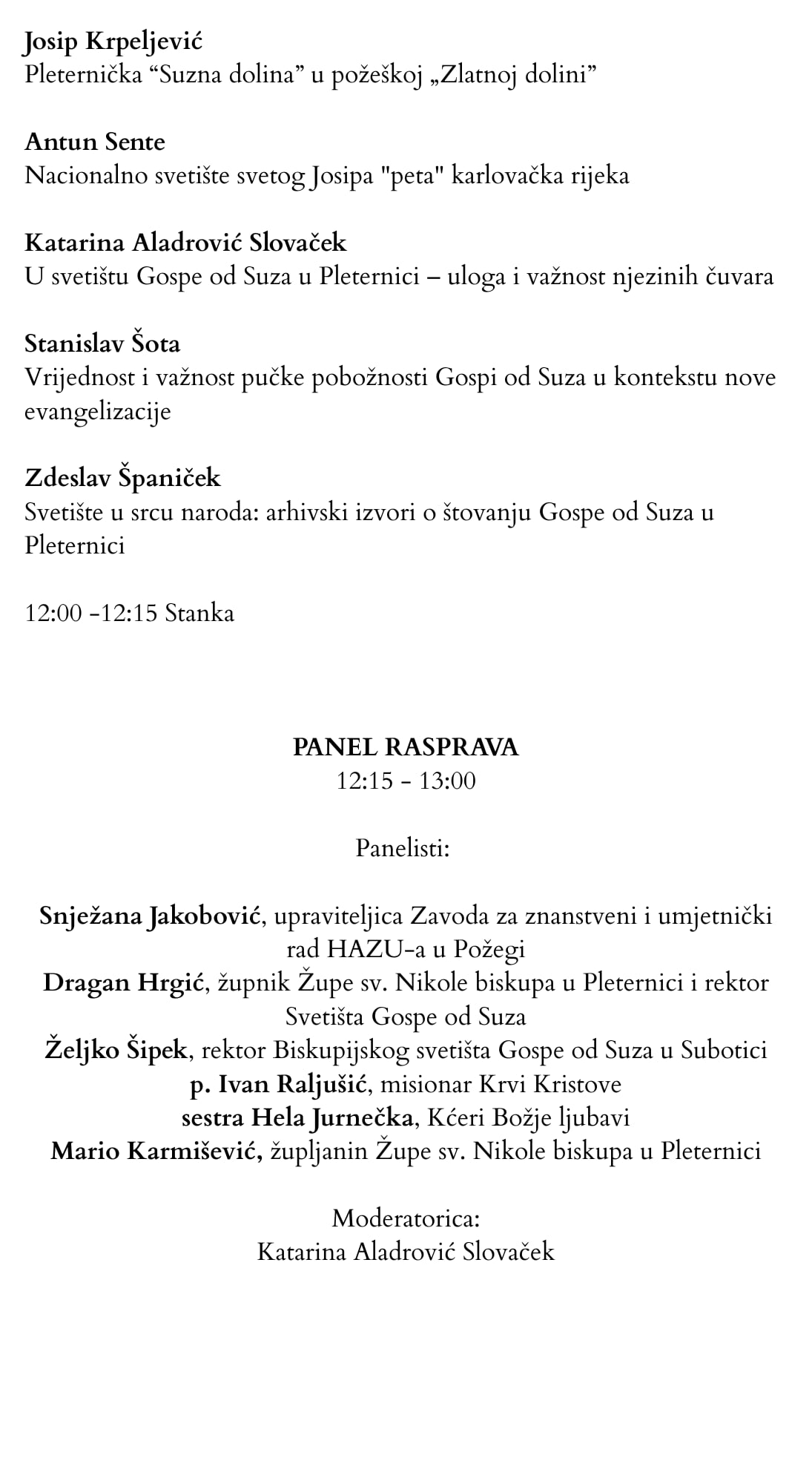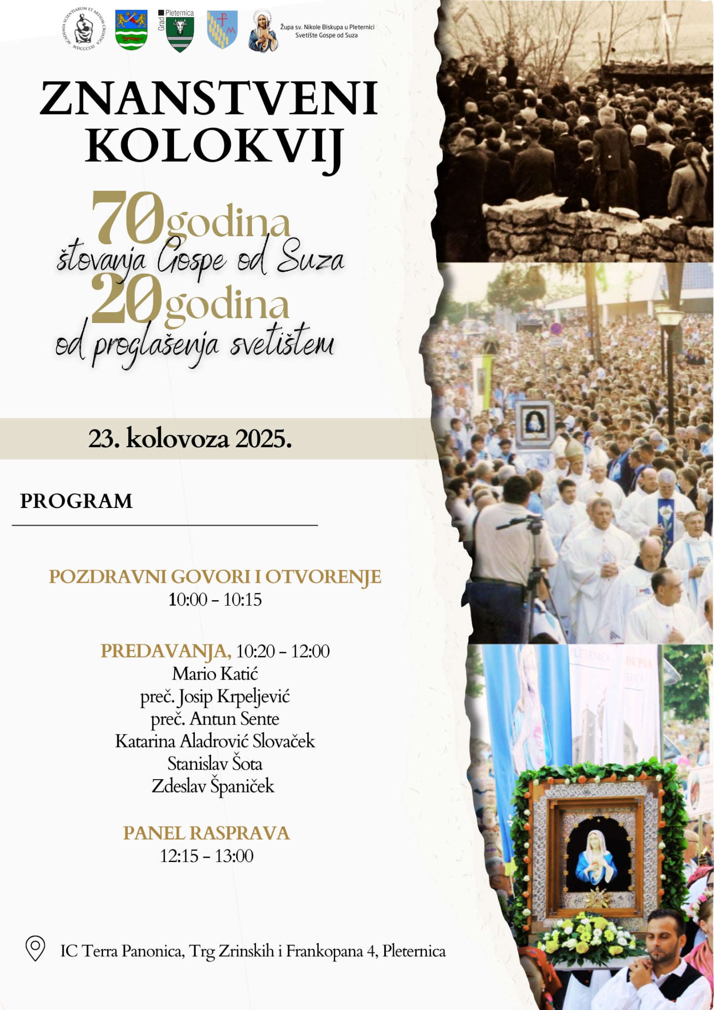 Hvala vam na vašem svjedočanstvu ljubavi prema Blaženoj Djevici Mariji koju pokazujete vašim dolaskom. Upravo vaša vjera i pobožnost učinile su ovo Svetište poznatim te nakon Siracuse najvećim Svetištem Gospe od Suza u svijetu. Došli ste na milosno mjesto, mjesto molitve i sakramentalnog života u kojem Gospodin po Marijinu zagovoru želi svakoga od vas dotaknuti i potaknuti na obraćenje. Gospa od Suza prima sve – i radosne i žalosne, jer kao majka najbolje razumije suze svoje djece. Ovdje niste sami: s vama su tisuće hodočasnika koji su tijekom proteklih godina dolazili i ostavili svoj trag, a iznad svega s vama je Isus, kojega nam Marija uvijek pokazuje i daruje. Neka vas Gospa od Suza zagovara i prati na vašim životnim putovima da se iz ovog svetišta vratite ispunjeni snagom Duha Svetoga, učvršćeni u vjeri, u nadi postojani. Dobro došli u Pleternicu, dobro došli u Svetište Gospe od Suza!“