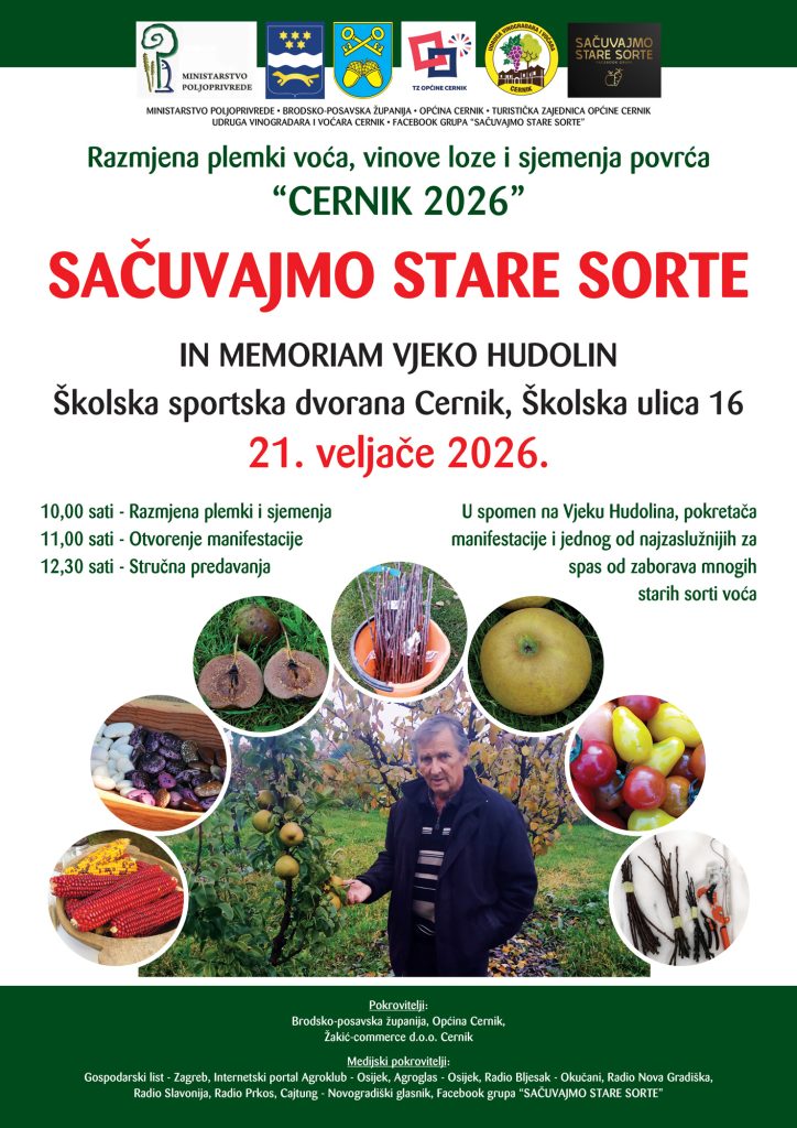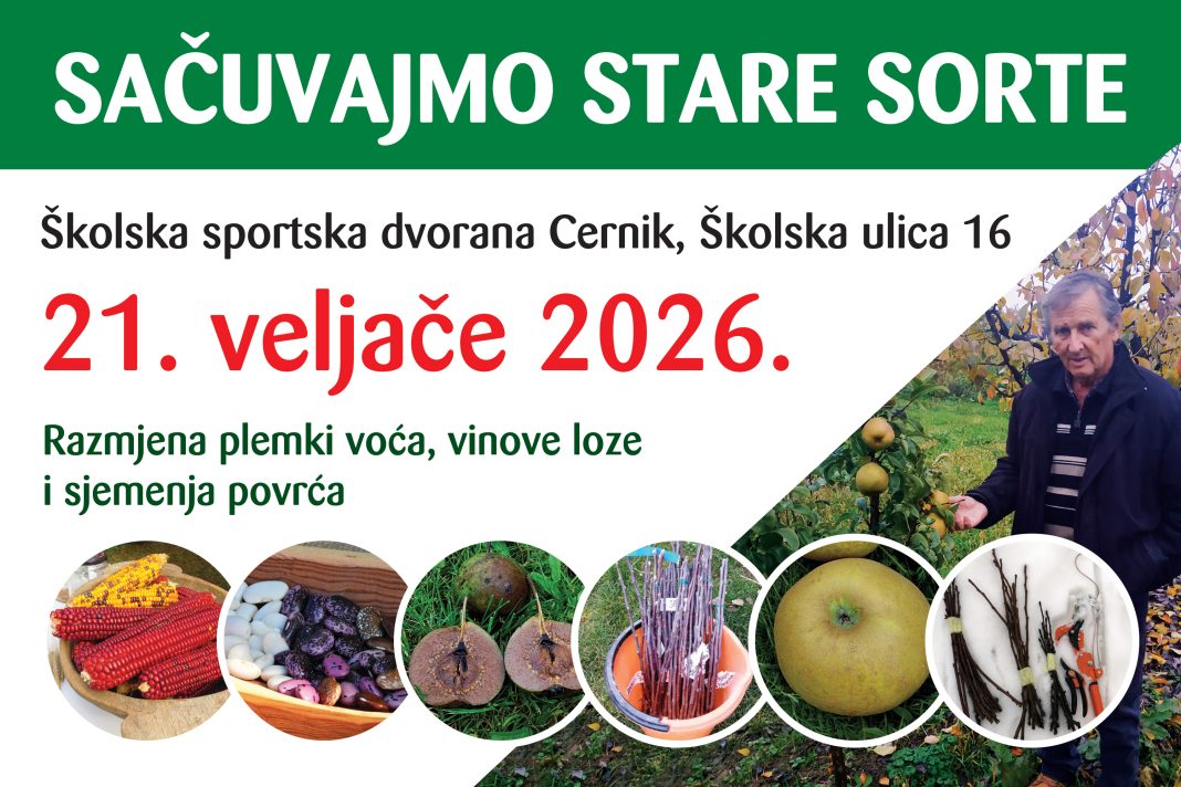 Ovogodišnje izdanje održat će se 21. veljače 2026. godine, s početkom u 10 sati, u sportskoj dvorani Osnovne škole Matija Gubec u Cerniku. Izlagači iz svih dijelova Hrvatske, ali i gosti iz zemalja regije te Njemačke i Austrije, nesebično će dijeliti plemke starih sorti voća, razmjenjivati znanje i iskustva te promovirati važnost očuvanja domaćih, zaboravljenih sorti.
