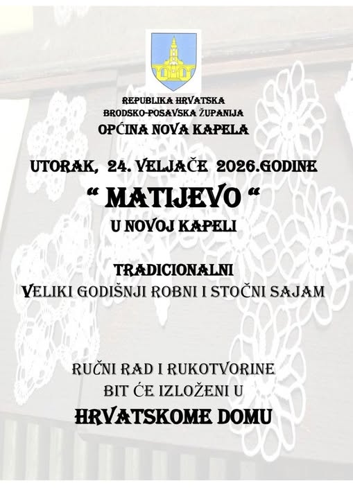 Općina Nova Kapela sutra organizira tradicionalni, veliki godišnji robni i stočni sajam pod nazivom “Matijevo u Novoj Kapeli”. Sajamska tradicija u Novoj Kapeli duga je više od sto godina, a s ciljem njezinog očuvanja sutra, 24. veljače na “Matijevu” će se i ove godine okupiti izlagači, ali i zainteresirani posjetitelji. Ručni radovi i rukotvorine bit će izloženi u Hrvatskom domu u Novoj Kapeli.