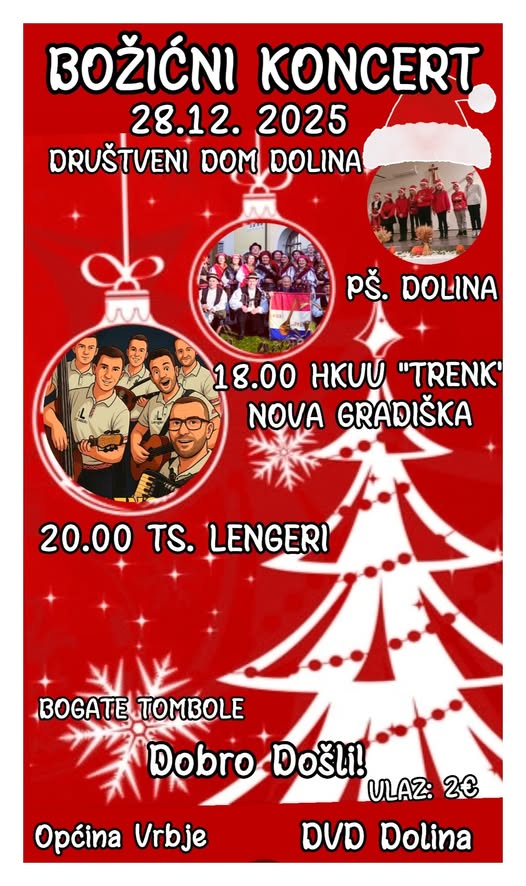 Božić je vrijeme za radost, veselje i druženje. Upravo zato, Općina Vrbje i Dobrovoljno vatrogasno društvo Dolina organiziraju i pozivaju vas na tradicionalni Božićni koncert koji će se održati sutra, 28. prosinca u 18.00 sati u Društvenom domu u Dolini.
