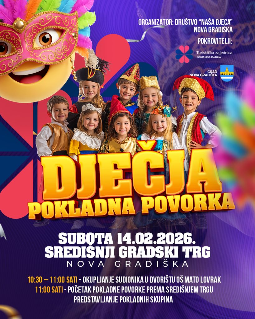Turistička zajednica Grada Nova Gradiška poziva sve građane, male i velike, da im se u subotu, 14. veljače, pridruže na Središnjem gradskom trgu u Novoj Gradiški na još jednom veselom izdanju Dječje pokladne povorke.