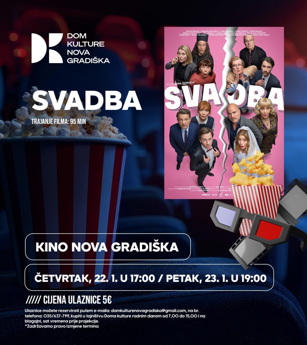Ulaznice možete rezervirati putem e-maila: [email protected], na br. telefona: 035/637-799, kupiti u tajništvu Doma kulture radnim danom od 7,00 do 15,00 i na blagajni, sat vremena prije projekcije.