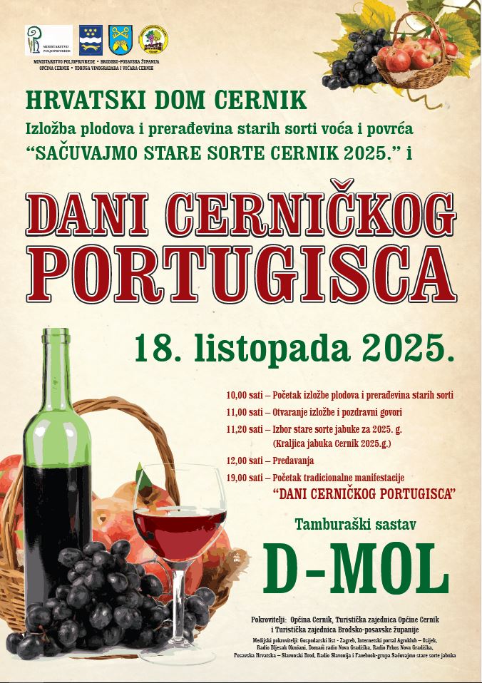 Cernik ponovno postaje središte tradicije, okusa i mirisa! U subotu, 18. listopada 2025., u Hrvatskom domu Cernik održava se bogata manifestacija „Dani Cerničkog Portugisca“ uz prateći sajam i izložbu plodova i prerađevina starih sorti voća i povrća „Sačuvajmo stare sorte Cernik 2025.“.
