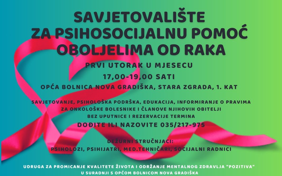 Udruga Pozitiva Savjetovalište organizira u suradnji s Općom bolnicom Nova Gradiška i uz podršku Brodsko-posavske županije, a onkološkim bolesnicima i članovima njihovih obitelji dostupno je bez uputnice i bez potrebe za prethodnom rezervacijom termina.