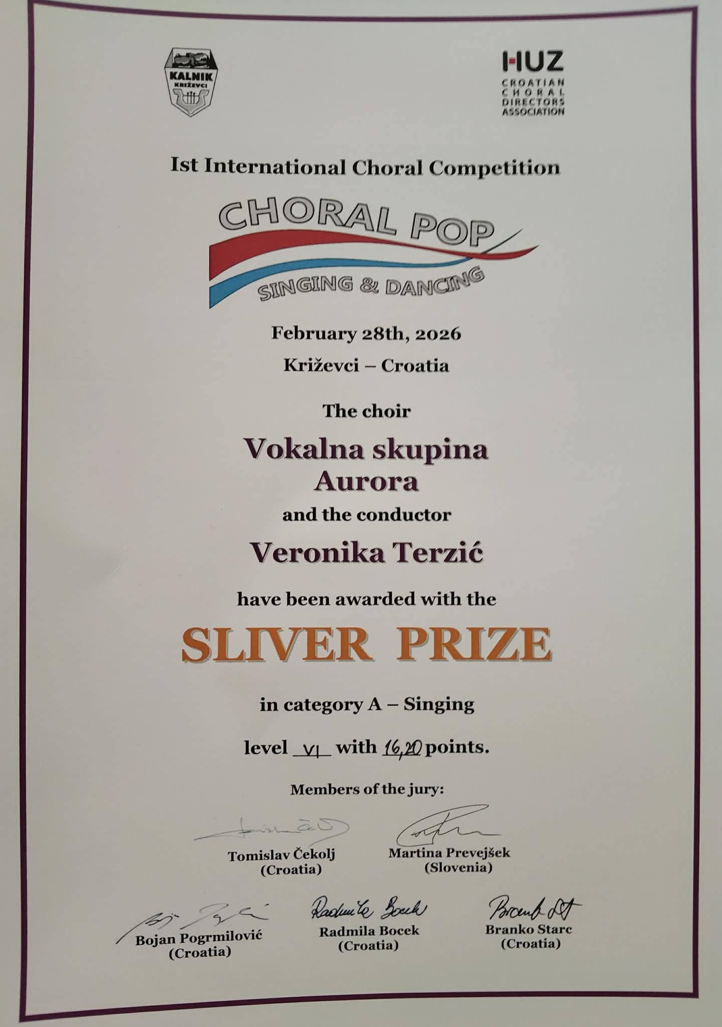 Vokalna skupina Aurora sudjelovala je 28. veljače 2026. na 1. međunarodnom natjecanju zborova „Choral Pop – Singing & Dancing“ održanom u Križevcima, gdje je ostvarila zapažen uspjeh osvojivši srebrnu plaketu s ukupno 16,20 bodova.